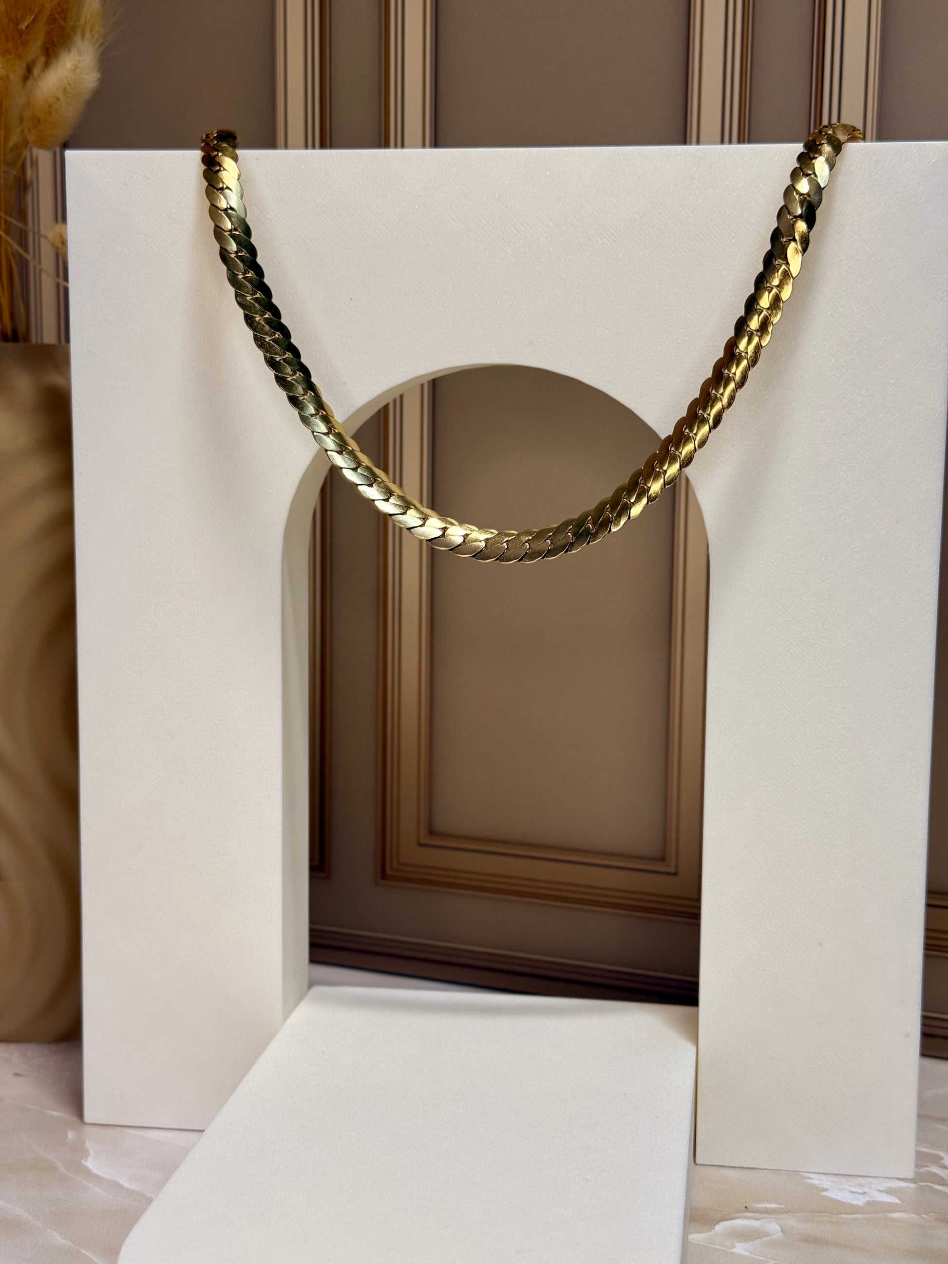 Elaborada en oro laminado 18K, ofrece una apariencia de lujo con gran resistencia al desgaste. Su estructura flexible y caída perfecta aportan un look audaz, estilizado y atemporal.