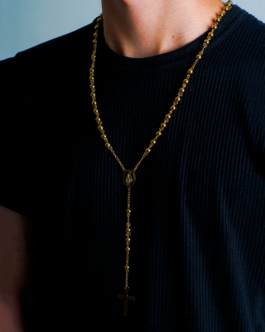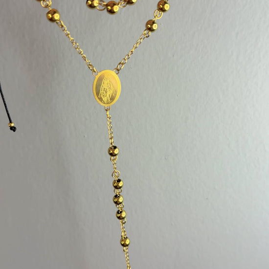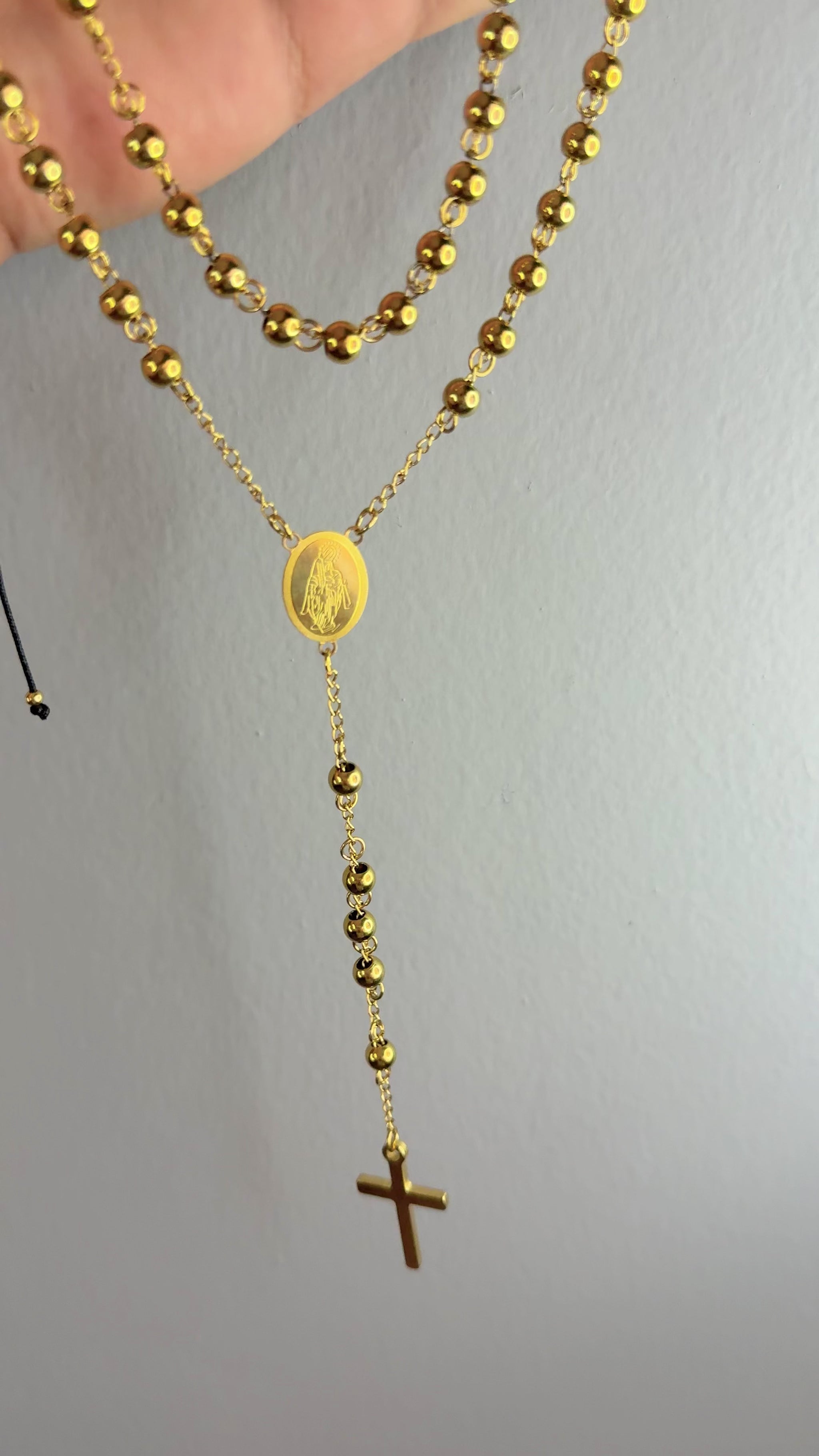 Una pieza de fe con acabado de lujo. Lleva tu espiritualidad con estilo con esta camándula mediana en oro laminado 18K.