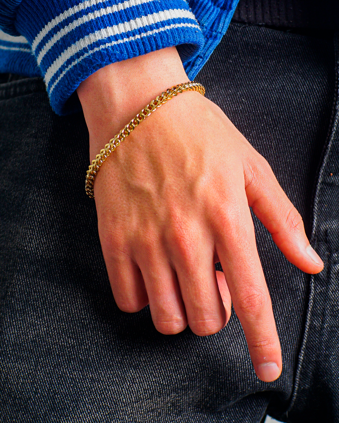 Fabricada en oro laminado 18K, garantiza un acabado brillante, duradero y resistente al uso diario. Con 20 cm de largo, se ajusta perfectamente a la muñeca, ofreciendo comodidad sin perder presencia visual.